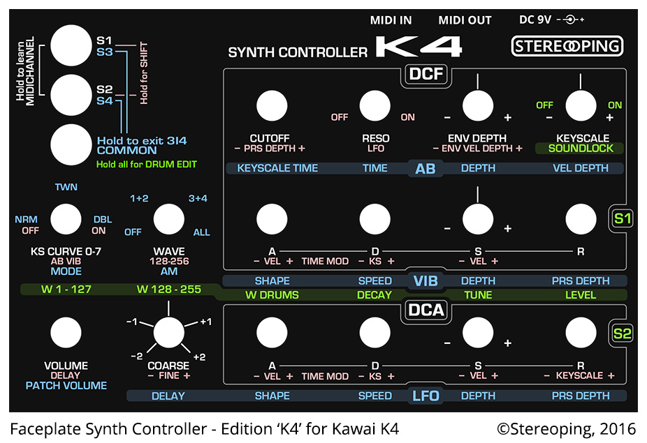 | Panel Controls & Jacks : | Write SW,Power SW, DC in, Output Stereo L/R (Mono)(K4r + 1-6), (K4 : Wheel x 2), Phone Jack, Card Slot, MIDI-IN/OUT/THRU |